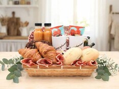 El desayuno a domicilio Romántico para dos personas contiene: 2 Croissants 2 Cookies con tres chocolates 2 Mini Molletes 2 Sobres de Jamón de cebo ibérico 35grs envasado al vacío 2 Botellitas de Aceite Virgen Extra 20cl 2 Tarrinas de tomate natural triturado 2 Sobres de sal 2 Mermeladas de fresa 2 Zumos de naranja 100% exprimido 2 Tazas de porcelana modelo “Besayúname” Variedades de café Sobres de té gourmet “The Capsoul” Azúcar Edulcorante Tarrinas de leche Cucharillas de bambú Cuchillos de bambú Servilletas Cesta envuelta en papel celofán con lazos (el modelo puede variar) Tarjeta recordatoria con el mensaje que tú quieras