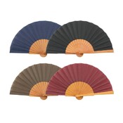 Abanico de caballero de 19 cm. de calidad y resistente, fabricado con varillas de madera natural y tela lisa en tonos sobrios y elegantes. Es cómodo de llevar y de uso diario. Complemento de verano indispensable.