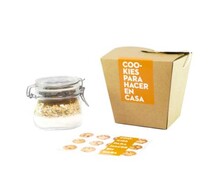 ¿Qué incluye el tarro de cookies?: El tarro de cristal hermético contiene los ingredientes para hacer 20-22 galletas de avena con pepitas de chocolate. Tarro de cristal hermético de la mejor calidad (lo amarás luego para guardar cosas en casa). Ingredientes para hacer las galletas ordenados por capas en el interior del tarro: Harina, avena, pepitas de chocolate, azúcar moreno, bicarbonato, sal.Tarjeta con la receta y las instrucciones paso a paso. ¡Súper sencillo!. Caja de cartón contenedora decorada y con protección interior. Se incluye tarjeta recordatoria con el mensaje que tú quieras.